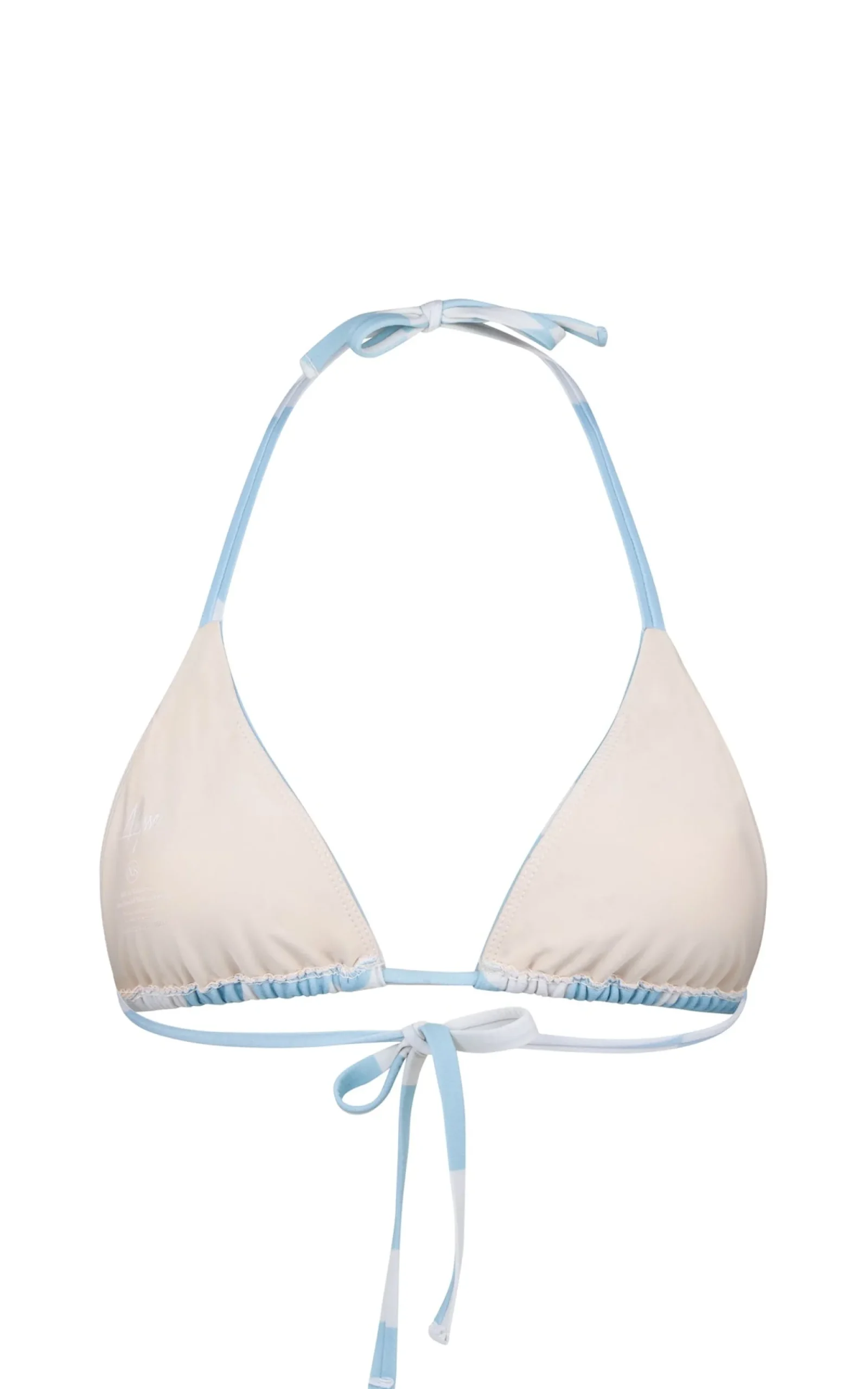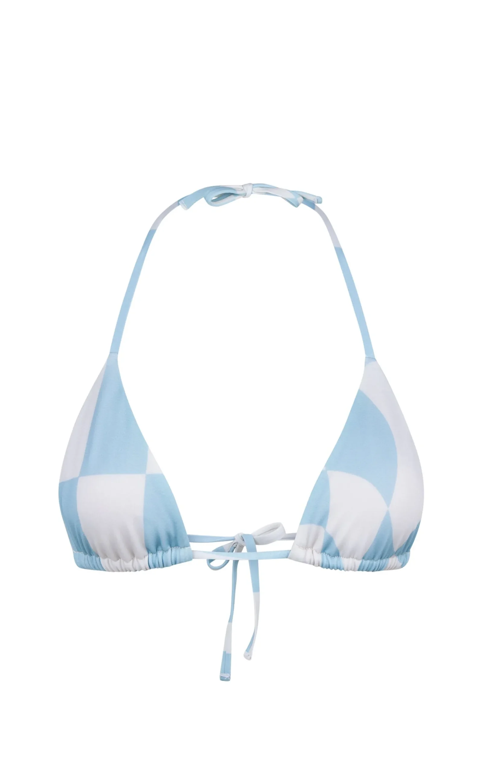 Classic triangle top, attached via a neck and back bow tie. The bust cups have a ruched aesthetic look but are also adjustable to your own body.