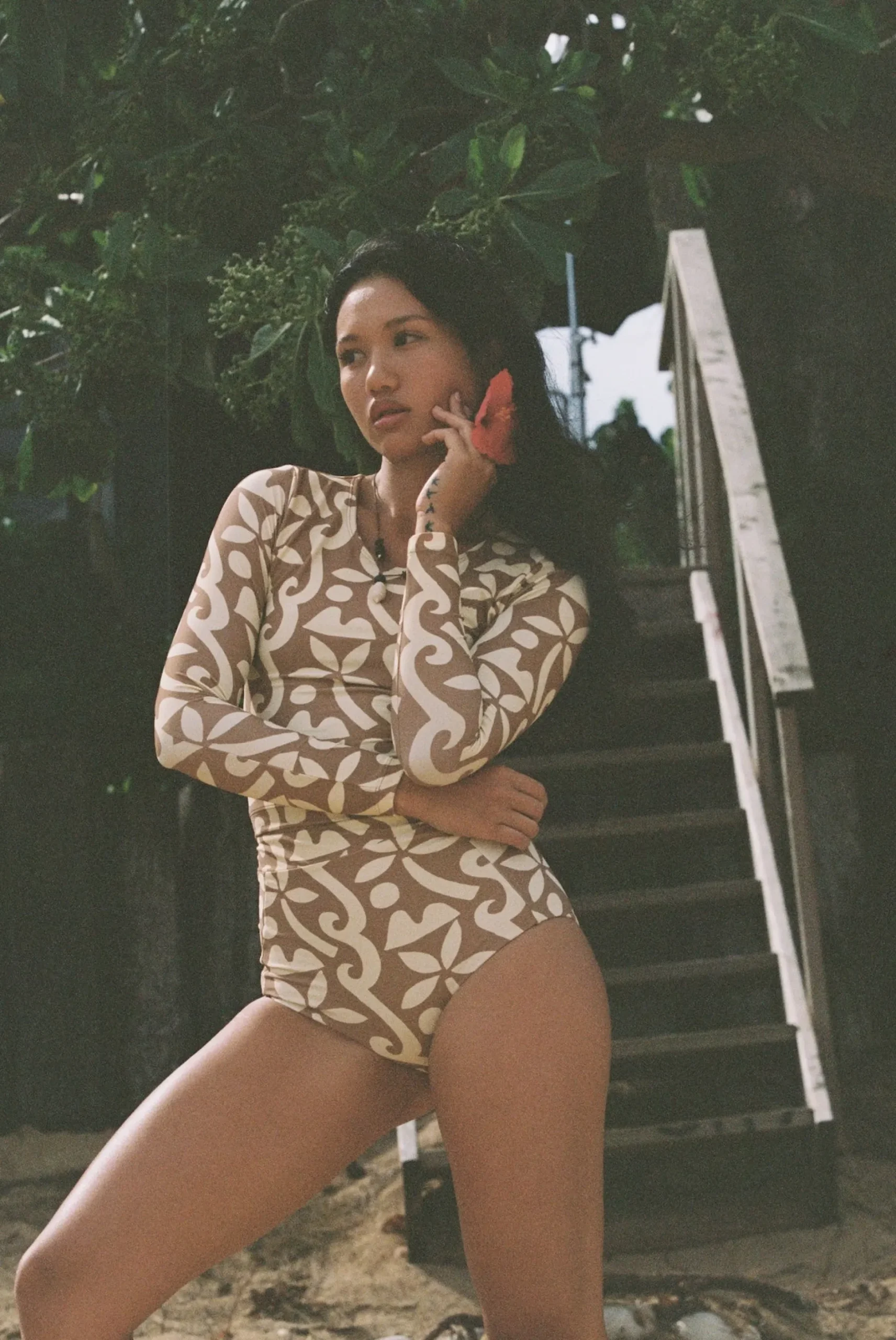 Introducing Poppler, our new long-sleeve rash guard — a second-skin silhouette designed for full coverage and effortless elegance in the ocean. Lightweight and protective, its cropped cut and scooped U-neck make it as flattering as it is functional. Slip it over your favorite bikini or pair it with matching bottoms for a sleek surf-ready look.
