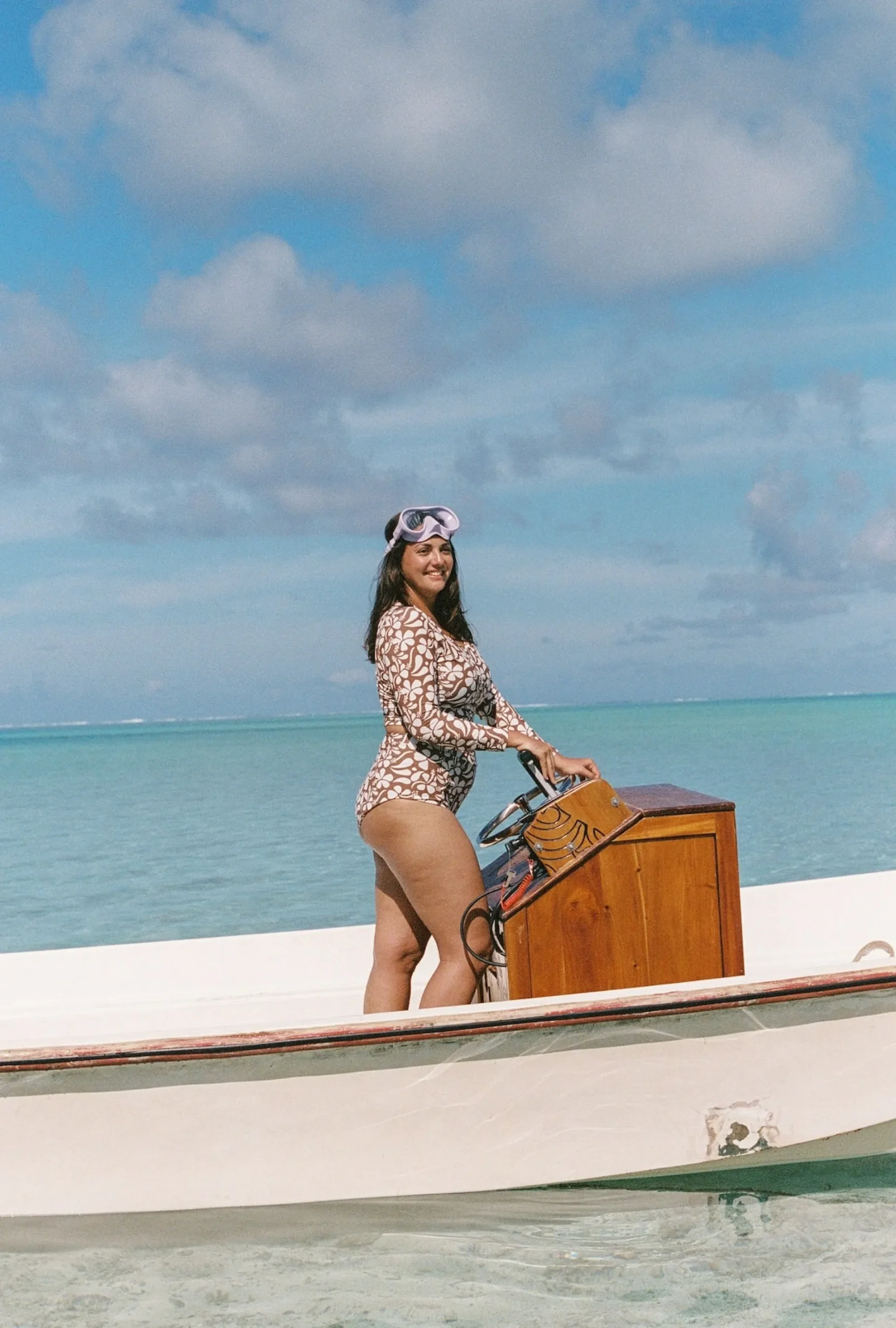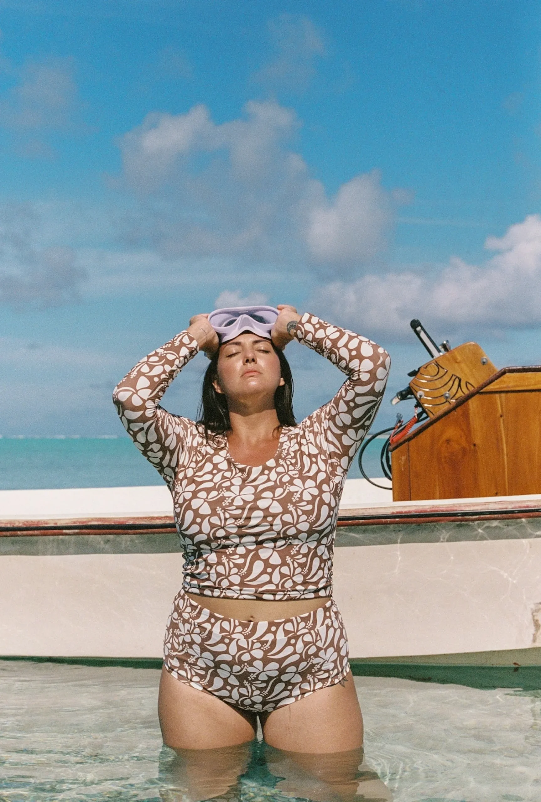 Introducing Poppler, our new long-sleeve rash guard — a second-skin silhouette designed for full coverage and effortless elegance in the ocean. Lightweight and protective, its cropped cut and scooped U-neck make it as flattering as it is functional. Slip it over your favorite bikini or pair it with matching bottoms for a sleek surf-ready look.
