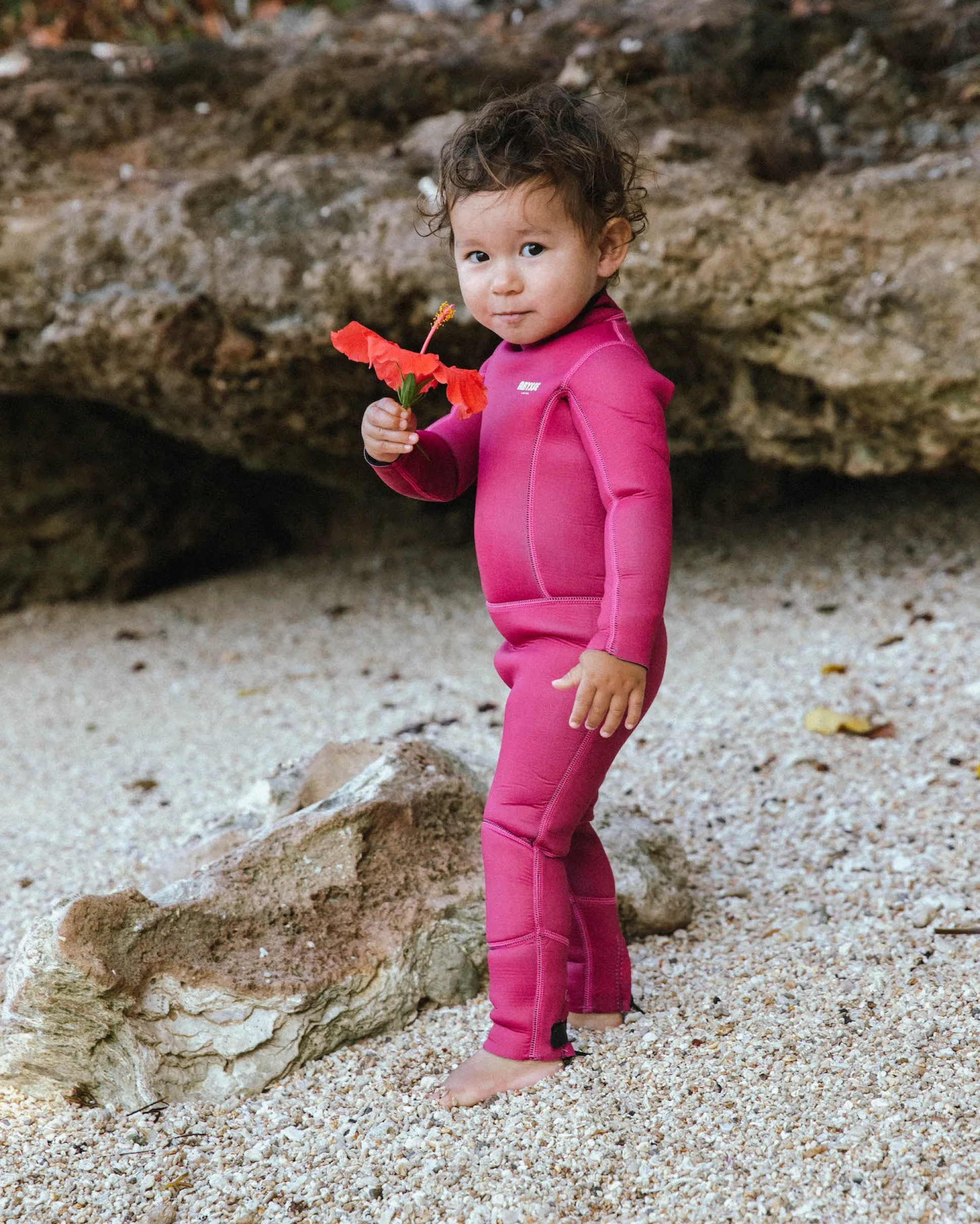 The ‘Nai’a’ Pitaya Red, our traditional full-suit, is a long arm and long leg wetsuit, made from 2mm limestone ecoprene, and doubled with a stretchy recycled lining from post consumer plastic bottles. Intentionally crafted with a most functional back zipper, as well leg zipper that make it easy to put on and take off, both complete with a lock and velcro closure, that keeps our little ones safe and warm.